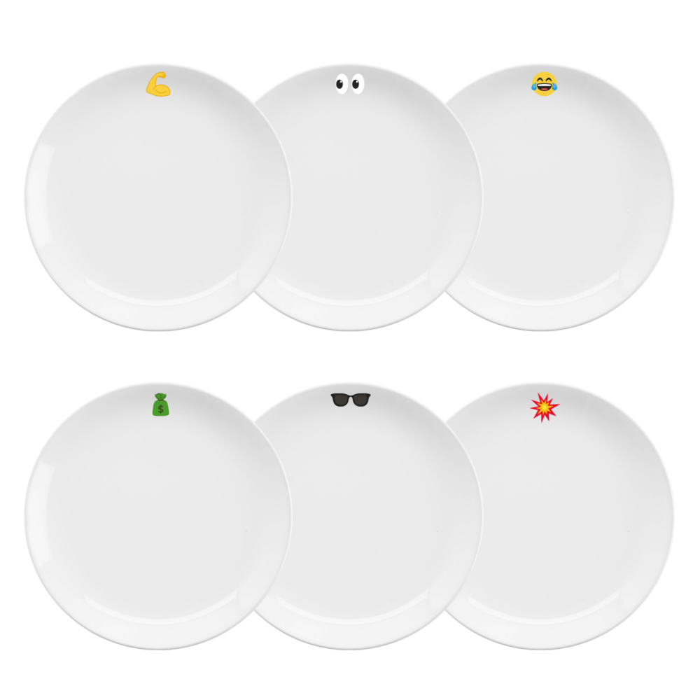 Coffret de 6 assiettes de 23.3 cm de diamètre en porcelaine blanche avec liseré or et sérigraphie emoji.